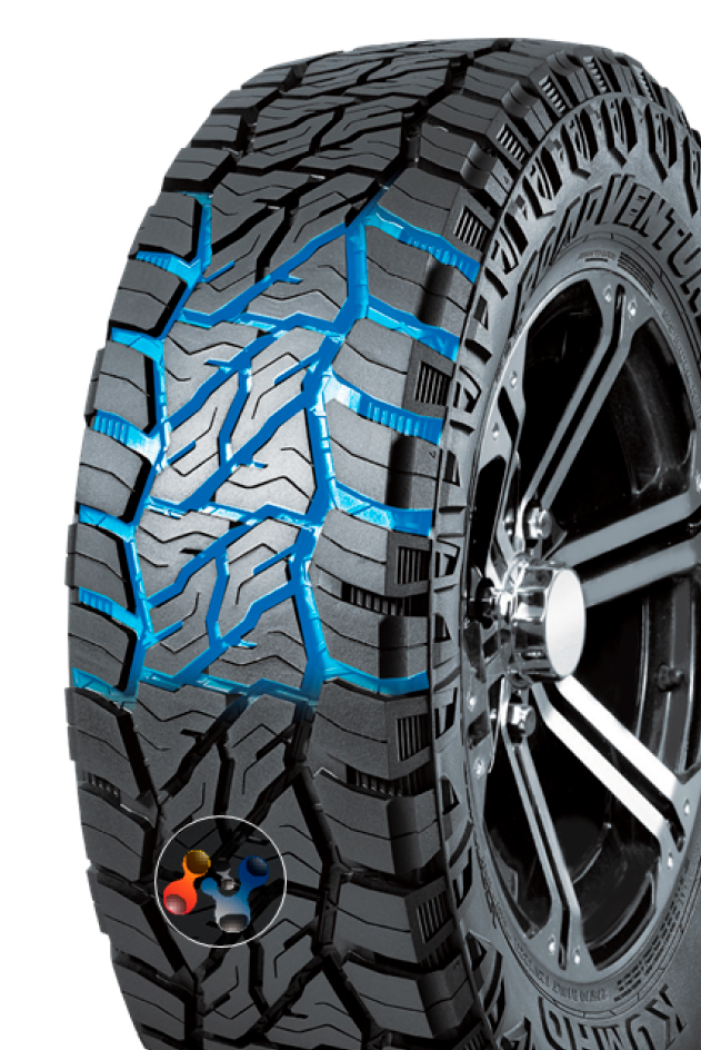 Одной из главных особенностей новинки является оптимизация протекторного рисунка, созданного для уверенного прохождения бездорожья. Плечи с пилообразными кромками и различной высотой улучшают контакт на рыхлых поверхностях, а многоугольные ламели в центральной зоне увеличивают связь на снегу и каменистом покрытии. Инновационные вставки Rock Tie-Bar повышают жесткость и сопротивляемость протектора сдвигу, что особенно важно при агрессивной езде вне асфальтированного покрытия. Специальная форма подканавочных элементов, напоминающая трещины на земле, препятствует застреванию камней и сохраняет рабочие свойства даже после длительных нагрузок.